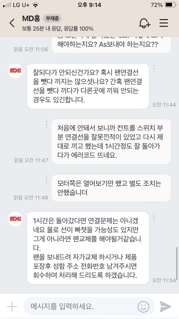 제품을 보내주면 팬교체를 해서 주겠다고 합니다. ^^ 보내지 않고 제가 직접 고치긴 했어요~ 응답시간을 보시면 응답도 빠르게 잘 해주시고 6개월 까지는 무상AS를 해주고 있습니다.