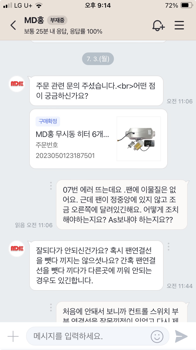 MD홍 무시동 히터가 가격이 비싸긴 하지만 그만큼 양심적으로 만들었다는 생각이 들고 저는 지금도 아주 잘 사용하고 있습니다.잘 사용하다가 07번 에러 팬이상이 나와서 AS문의를 한 적이 있었는데 답변도 정말 빠르게 옵니다.