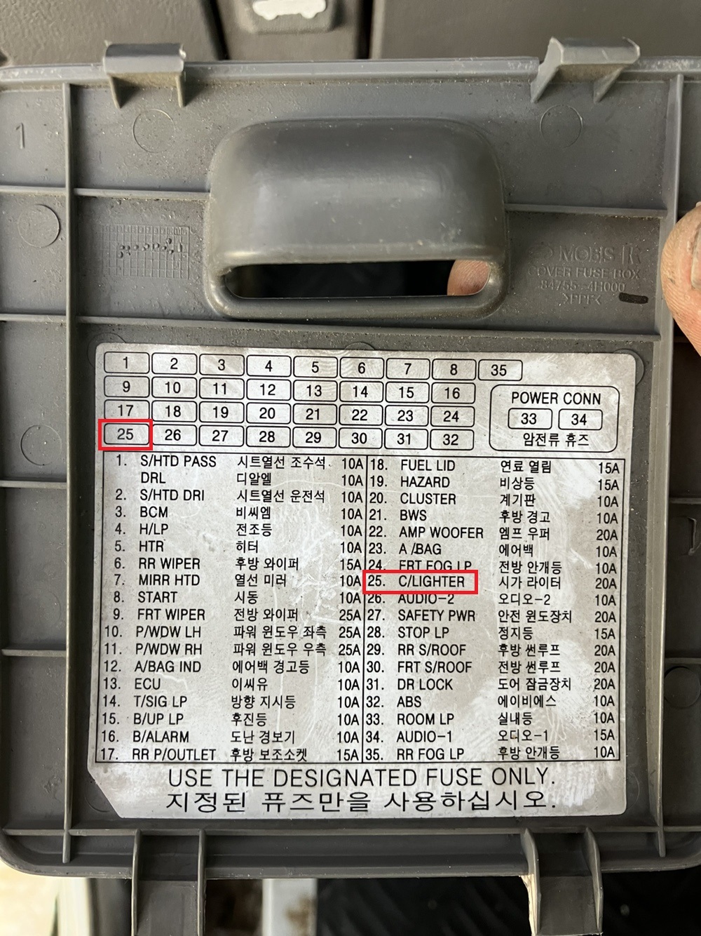 퓨즈박스에는 몇 번에 무슨 퓨즈가 들어가 있는지 자세히 설명이 나와있습니다. 스타렉스 같은 경우에는 25번이 시카라이터 퓨즈박스인데 25번에 ACC선을 연결해 주면 됩니다. 보통 블랙박스를 설치하면서 설치기사가 바로 이 25번에 블랙박스 ACC선을 연결하기 때문에 보통은 별도로 뺄 필요 없이 빠져 있을 것입니다.